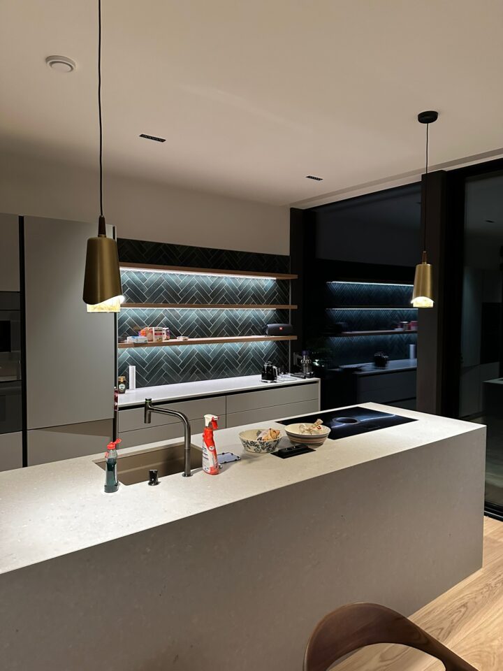 Työpistevalot automaattisesti kaappien alle. Himmennettävä yleisvalaistus koko tilaan. Liiketunnistimella toimivat yövalot. Kaikki ohjattavissa yhdellä katkaisijalla tai älypuhelimella.